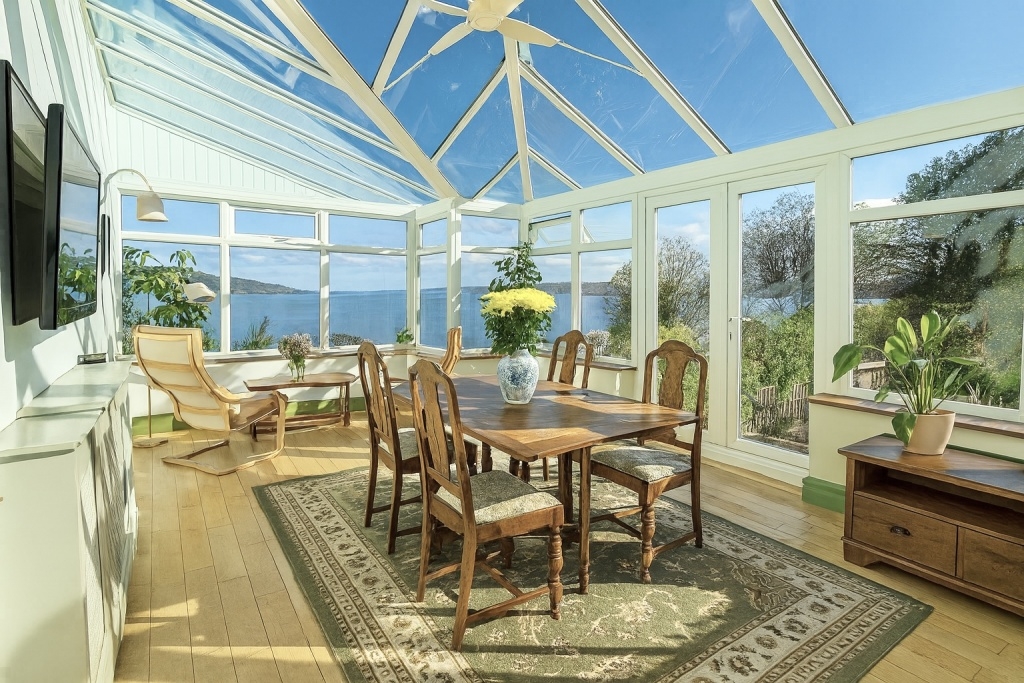 Stunning conservatory with double doors opening to the garden and over to the former tennis court . Solid Wood beech effect flooring. Radiator. Most amazing views over the open estuary Large radiator , Wall mounted TV