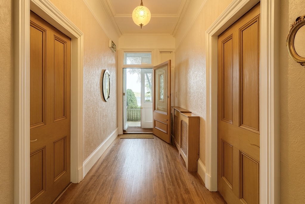 Corridor leads from the front hall to the back of the property. Mostly floored with ceramic tiles. Storage cupboard below the stairs with shelving. Side window floods the corridor with natural light, door to the shower room.
