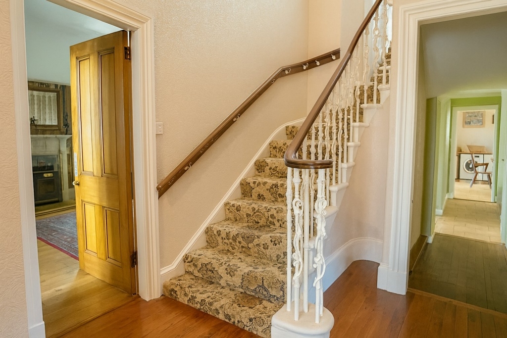 Carpeted stairs leading to the half landing and upper bedrooms. Original detailed etched glass panel window floods the stairway with natural light.