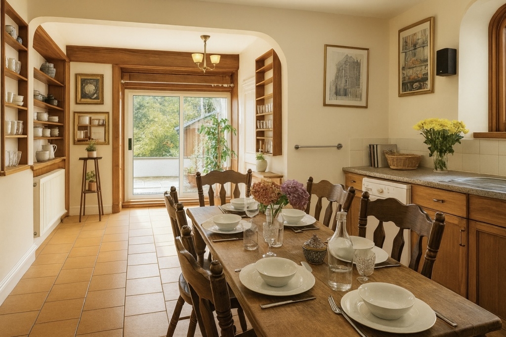 Ceramic floor tiles. Plenty space for large dining table and chairs. Door leads to a wet room. Door leading from the kitchen to annex room and the office/ store room. Radiator. With fixed shelving above. Back door to the driveway area .