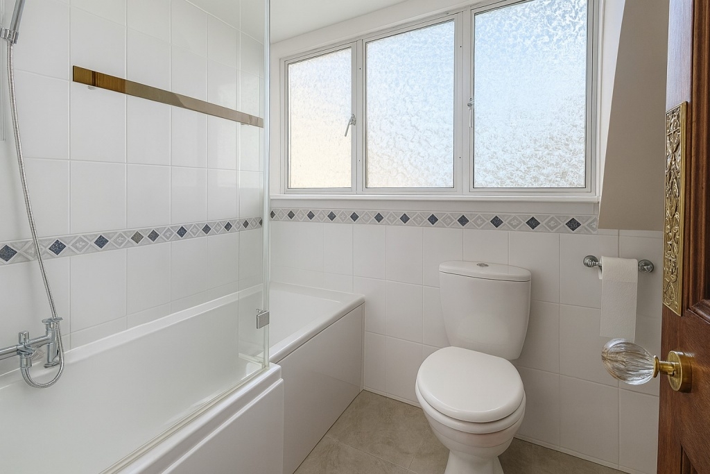 W.C Wash hand basin on pedestal bath with mixer taps and shower head. Mostly tiled walls with border tiling, window to the side with privacy glass. Extractor fan. Radiator. Ceramic tiled floor.