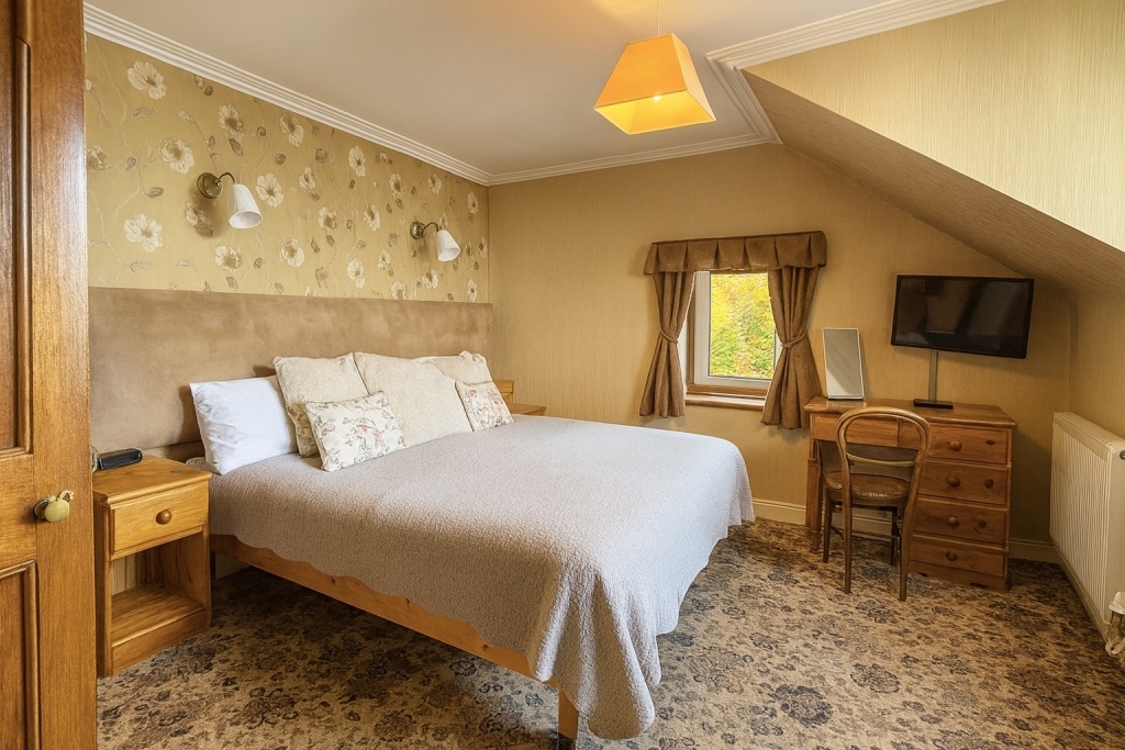 Duel aspect windows to the front and side both with stunning views . Large spacious bedroom matching traditional bedroom furniture. Wardrobe bedside cabinet s dresser with mirror. Radiator. Carpeted . Cornice. Pendant light.