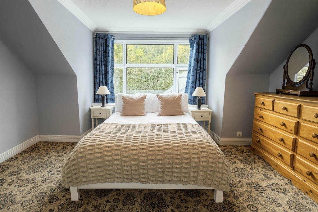 Another good size double bedroom with duel aspect windows to the back and the side of the property windows with amazing views over the gardens and open Clyde estuary.