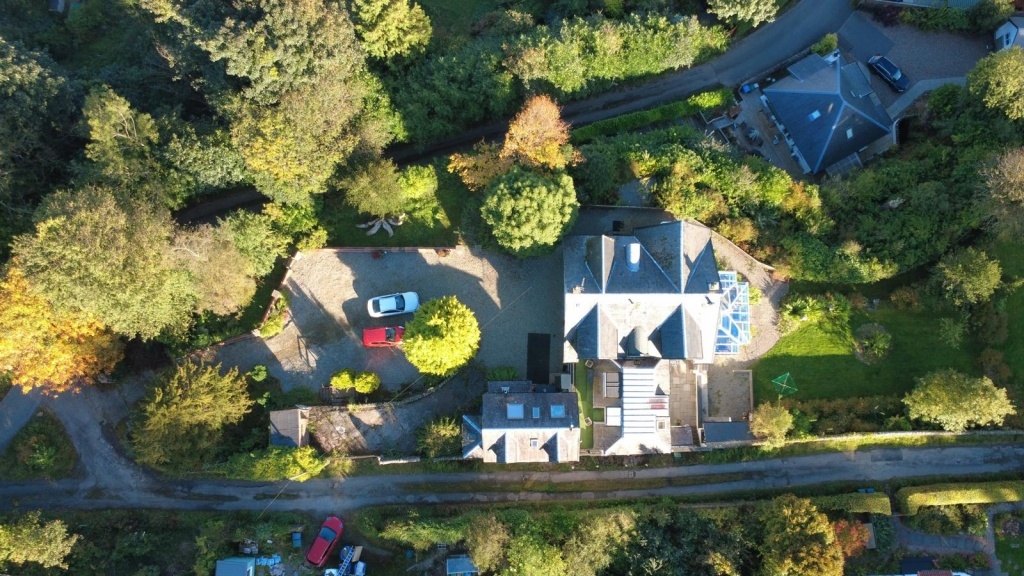 Large lawn formally a tennis court with border flower beds mature shrubs and bushes surround the main garden area. Gravelled driveway with wrought iron gates leading of Whites Brae to Duncreggan Lane and the garage for the property . The driveway has plenty parking and hard standing, Two large Garden sheds , wood storage , Pond with running stream,