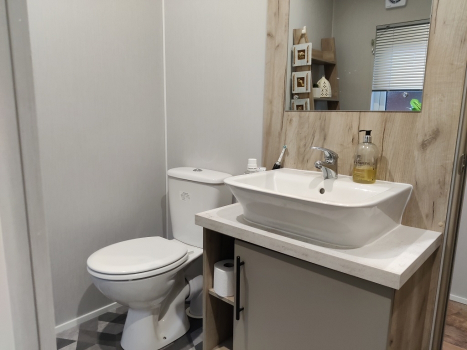 WC wash hand basin on vanity shower enclosure window with privacy glass.