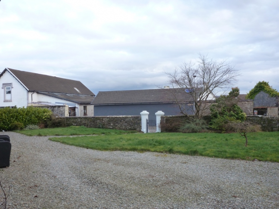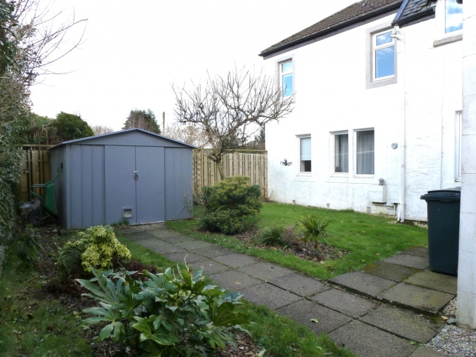 Front garden with gravel pathways and paved parking area at the side. Large Garden shed located to the back . Easily managed gardens with flower beds and shrubs and mature bushes . Outside water tap