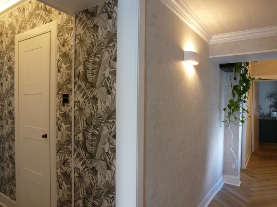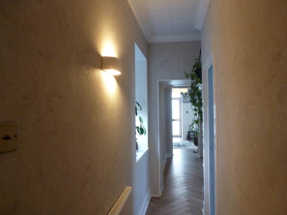 Back hall with matching flooring L-shaped. With access to cloak room . Family bathroom. Two walk-in cupboard s and utility room. Back hall leads to Two further bedrooms. Window to the north side. Wall lighting and radiator. Cornice.