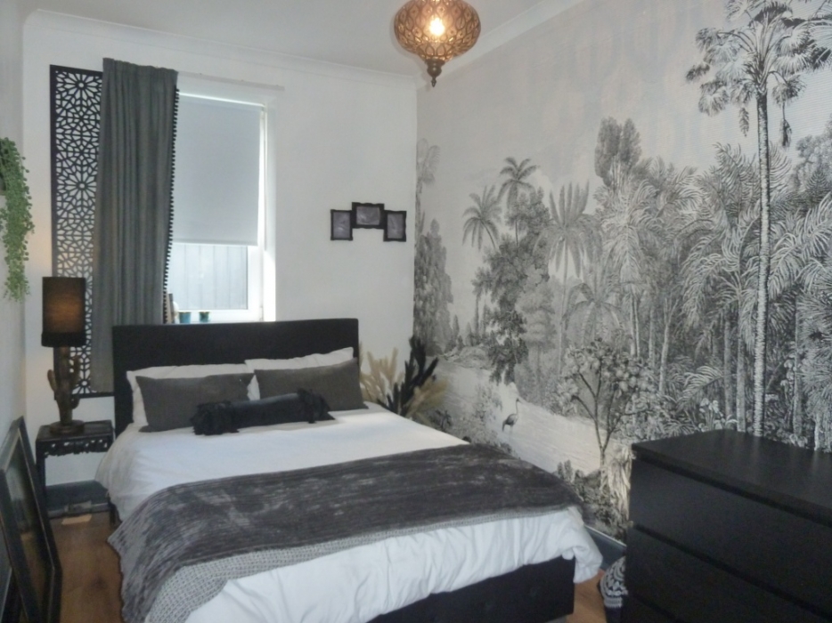 Double bedroom with duel aspect windows to both sides. Pendant light coving. Fixed wall shelf. Radiator. Feature wall with botanical garden scene. Laminate Wood effect flooring.
