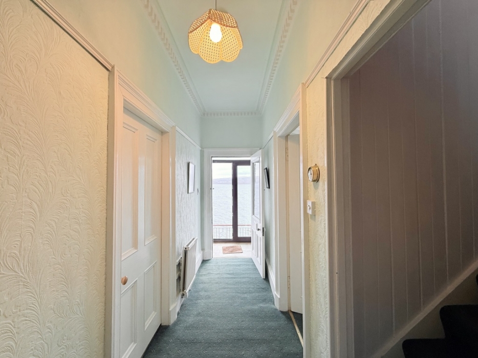 Bay window flood the room with natural light, stunning views over th Firth of Clyde. Focal point fire place with gas fire. Recess with shelving .Carpeted, radiator, picture rail, Pendant light