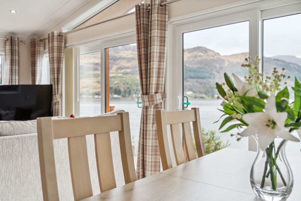 This 40ft x 20ft two-bedroom lodge features an open-plan living area with double sliding doors to the front leading to the generous front decking creating a sense of spaciousness and benefitting from the stunning open Loch Goil views . The living area includes two sofas focal point fire place with inset electric style stove.